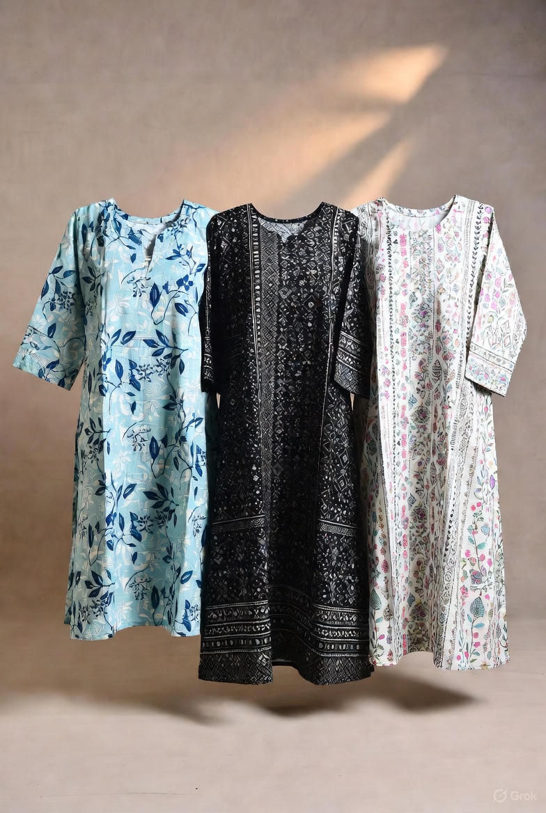 ब्लैक कलर की एथनिक लॉन्ग कुर्ती, ट्रेडिशनल प्रिंट और फ्रंट पैनल डिजाइन के साथ। फेस्टिव वियर और खास मौकों के लिए एक क्लासिक चॉइस।
