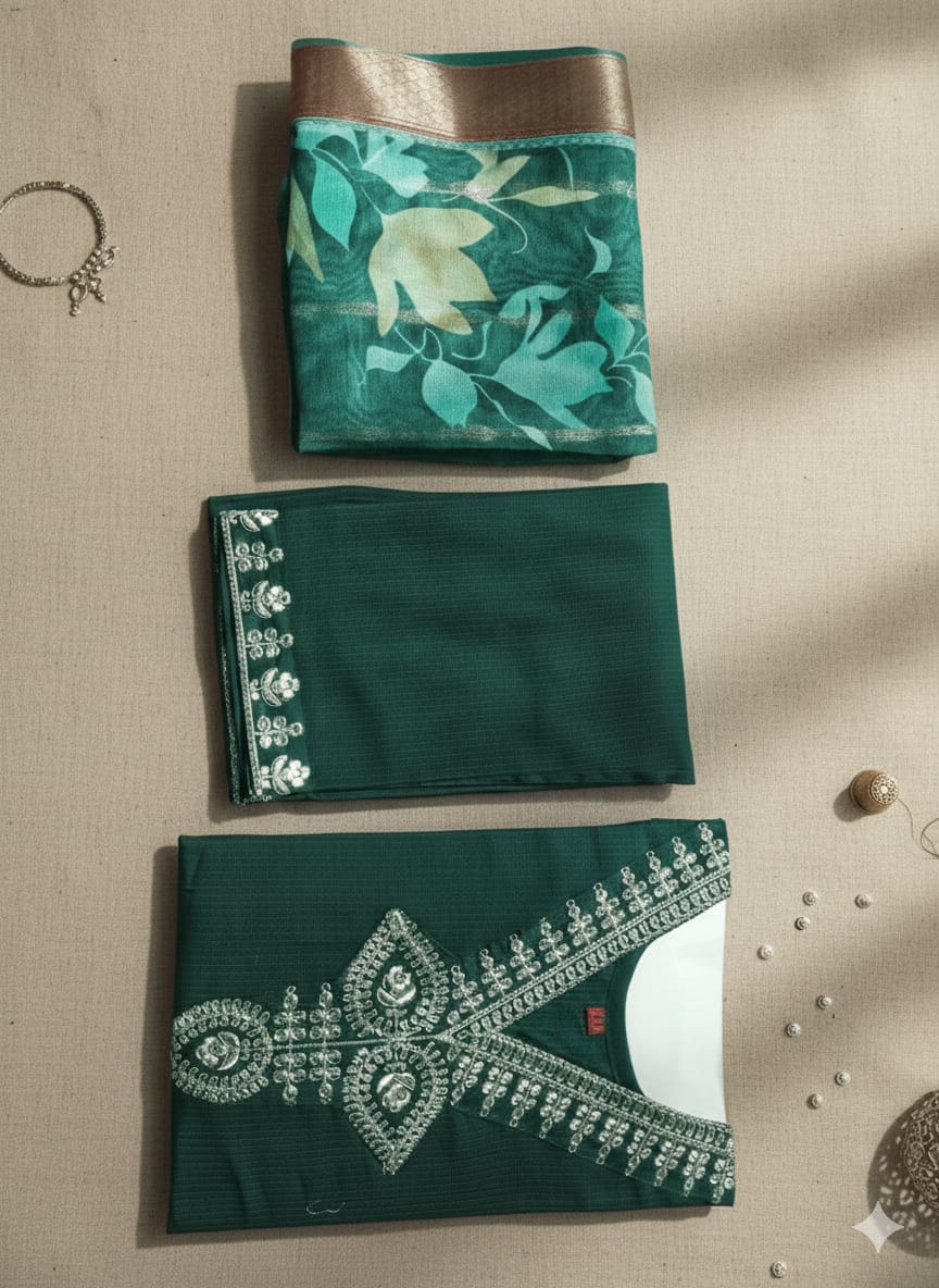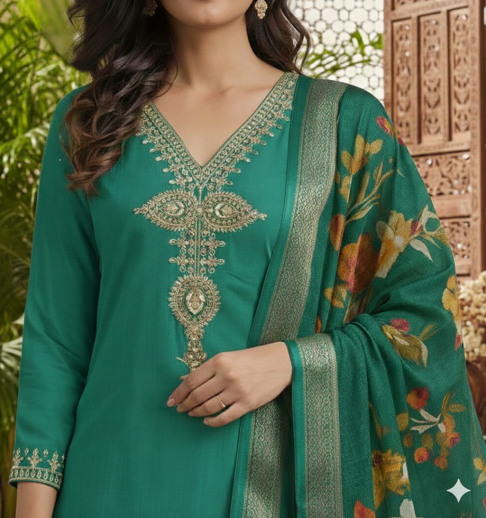 Ye set apne vibrant color aur elegant design ke liye perfect hai. Iska deep green shade aur contrast dupatta ek professional aur premium look deta hai.
