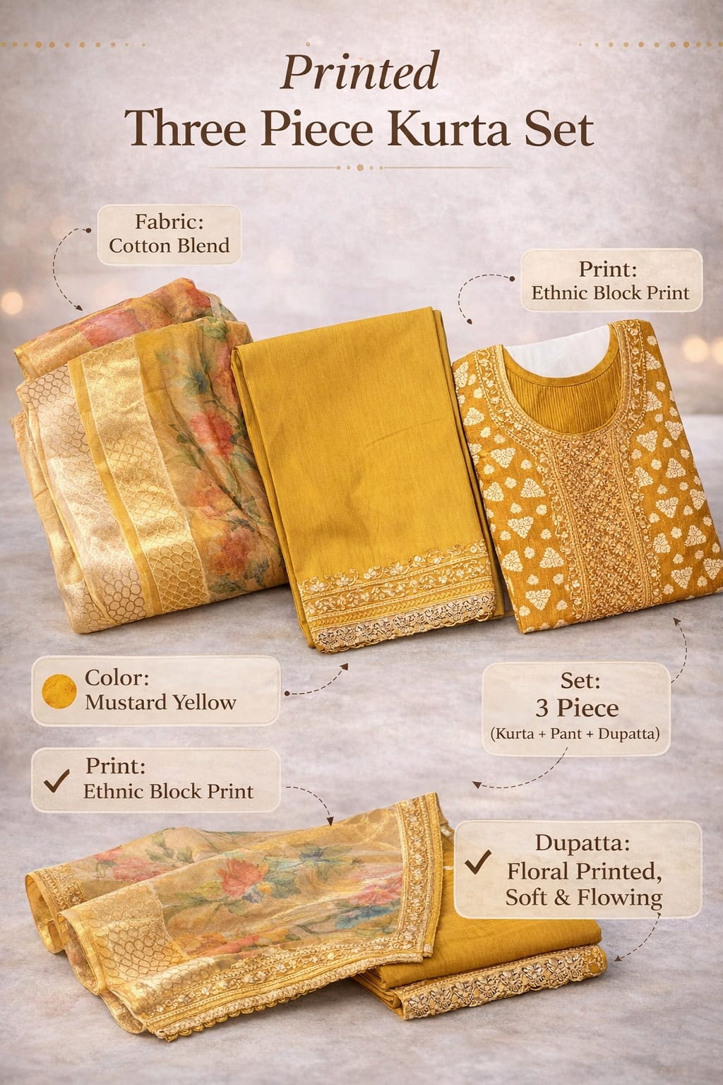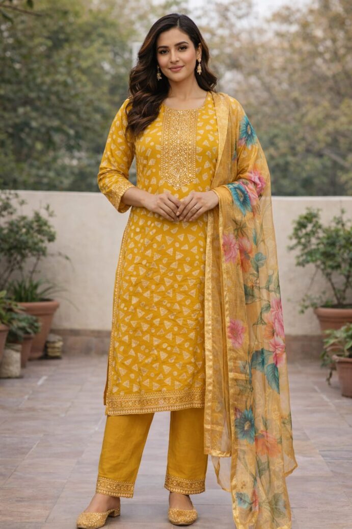 यह प्रीमियम Berlin Fabric अपनी शानदार चमक और मजबूती के लिए जाना जाता है। इसका गहरा सरसों जैसा पीला (Mustard Yellow) रंग किसी भी उत्सव या खास मौके के लिए एकदम सही है।