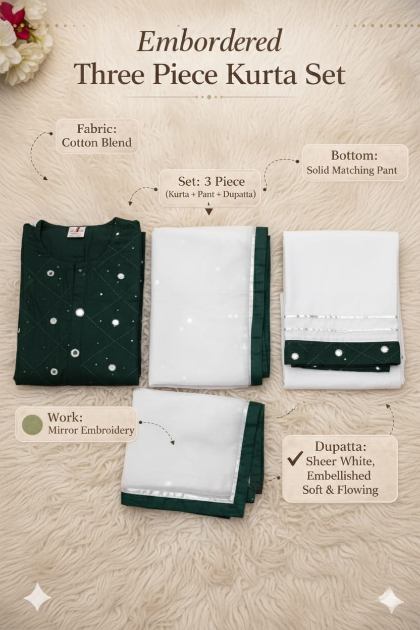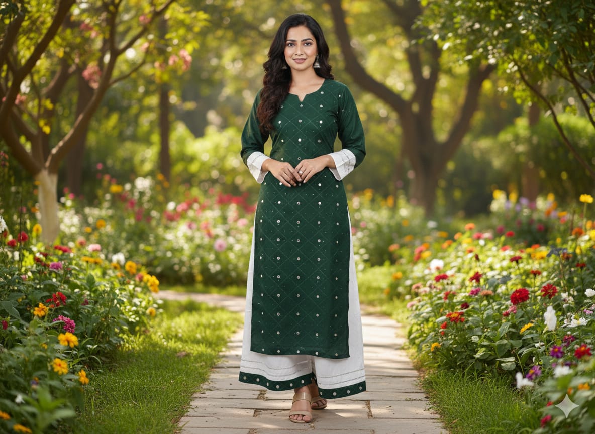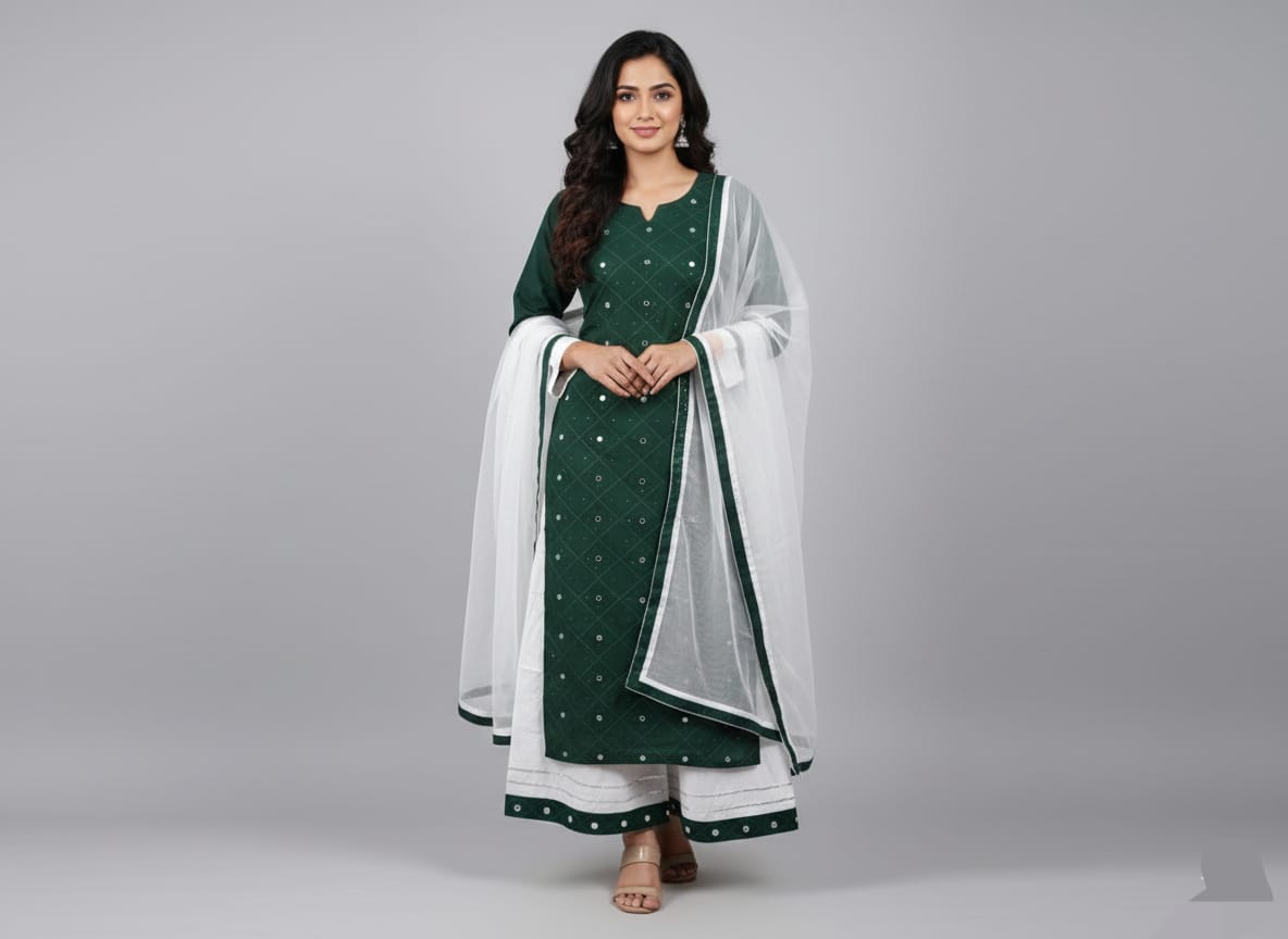 The rich bottle/emerald green hue exudes sophistication, while the soothing white net dupatta with delicate borders adds a touch of airy romance and flow. Paired with comfortable palazzo pants (or churidar in similar shade), this three-piece ensemble ensures all-day comfort without compromising on style.